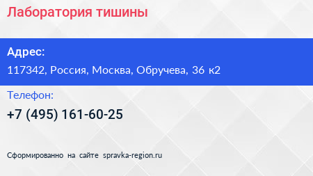 Лаборатория тишины по адресу 117342, Россия, Москва, Обручева, 36 к2 в дальнейшем Организация, размещена в следующих категориях: