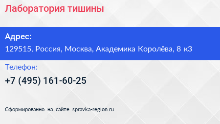 Лаборатория тишины по адресу 129515, Россия, Москва, Академика Королёва, 8 к3 в дальнейшем Организация, размещена в следующих категориях: