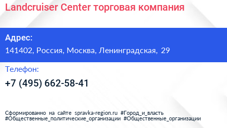 Landcruiser-Center, торговая компания по адресу 141402, Россия, Москва, Ленинградская, 29 в дальнейшем Организация, размещена в следующих категориях: