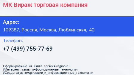 МК Вираж, торговая компания по адресу 109387, Россия, Москва, Люблинская, 40 в дальнейшем Организация, размещена в следующих категориях: