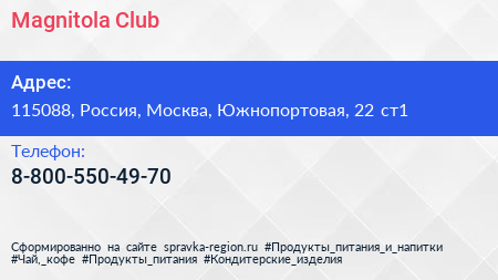 Magnitola Club по адресу 115088, Россия, Москва, Южнопортовая, 22 ст1 в дальнейшем Организация, размещена в следующих категориях: