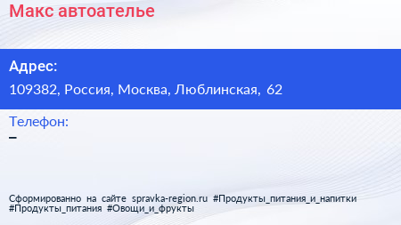 Макс, автоателье по адресу 109382, Россия, Москва, Люблинская, 62 в дальнейшем Организация, размещена в следующих категориях: