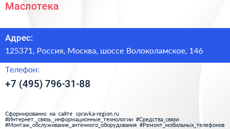 Маслотека по адресу 125371, Россия, Москва, шоссе Волоколамское, 146 в дальнейшем Организация, размещена в следующих категориях: