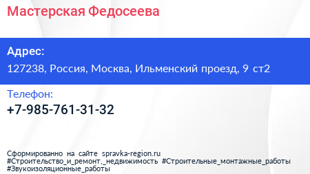 Мастерская-Федосеева по адресу 127238, Россия, Москва, Ильменский проезд, 9 ст2 в дальнейшем Организация, размещена в следующих категориях: