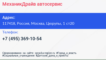 МеханикДрайв, автосервис по адресу 117418, Россия, Москва, Цюрупы, 1 ст20 в дальнейшем Организация, размещена в следующих категориях: