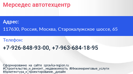 Мерседес, автотехцентр по адресу 117630, Россия, Москва, Старокалужское шоссе, 65 в дальнейшем Организация, размещена в следующих категориях:
