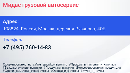 Мидас, грузовой автосервис по адресу 108824, Россия, Москва, деревня Рязаново, 40Б в дальнейшем Организация, размещена в следующих категориях:
