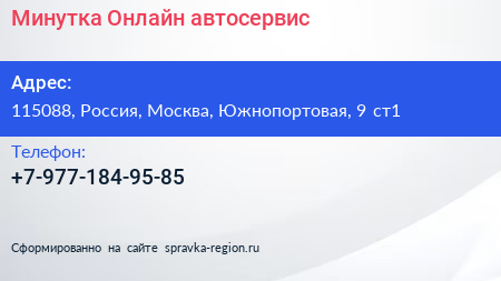 Минутка.Онлайн, автосервис по адресу 115088, Россия, Москва, Южнопортовая, 9 ст1 в дальнейшем Организация, размещена в следующих категориях: