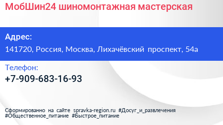 МобШин24, шиномонтажная мастерская по адресу 141720, Россия, Москва, Лихачёвский проспект, 54а в дальнейшем Организация, размещена в следующих категориях: