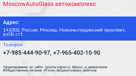 MoscowAutoGlass, автокомплекс по адресу 141002, Россия, Москва, Новомытищинский проспект, вл5Б ст1 в дальнейшем Организация, размещена в следующих категориях: