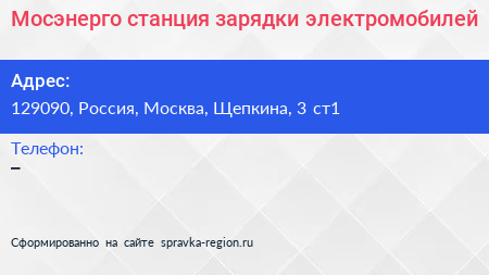 Мосэнерго, станция зарядки электромобилей по адресу 129090, Россия, Москва, Щепкина, 3 ст1 в дальнейшем Организация, размещена в следующих категориях: