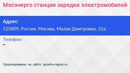 Мосэнерго, станция зарядки электромобилей по адресу 125009, Россия, Москва, Малая Дмитровка, 21а в дальнейшем Организация, размещена в следующих категориях: