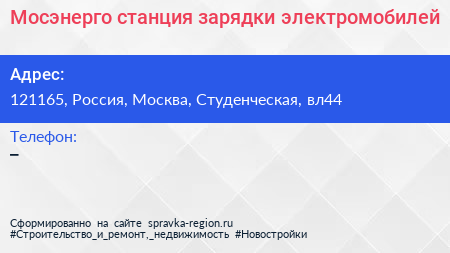 Мосэнерго, станция зарядки электромобилей по адресу 121165, Россия, Москва, Студенческая, вл44 в дальнейшем Организация, размещена в следующих категориях:
