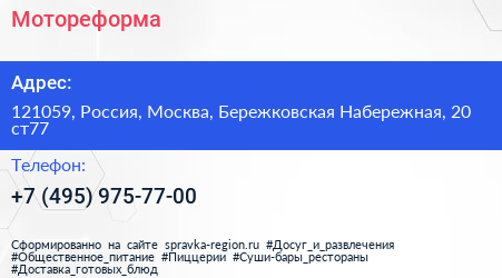 Мотореформа по адресу 121059, Россия, Москва, Бережковская Набережная, 20 ст77 в дальнейшем Организация, размещена в следующих категориях: