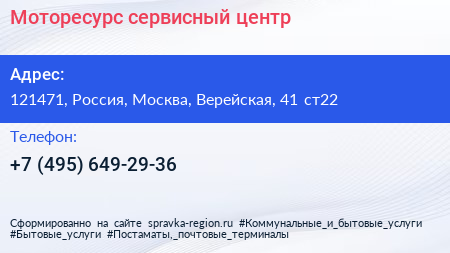 Моторесурс, сервисный центр по адресу 121471, Россия, Москва, Верейская, 41 ст22 в дальнейшем Организация, размещена в следующих категориях:
