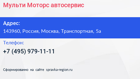 Мульти Моторс, автосервис по адресу 143960, Россия, Москва, Транспортная, 5а в дальнейшем Организация, размещена в следующих категориях: