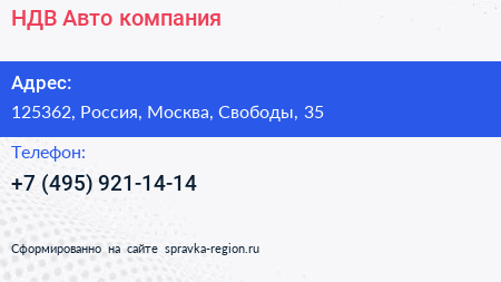 НДВ-Авто, компания по адресу 125362, Россия, Москва, Свободы, 35 в дальнейшем Организация, размещена в следующих категориях: