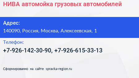 НИВА, автомойка грузовых автомобилей по адресу 140090, Россия, Москва, Алексеевская, 1 в дальнейшем Организация, размещена в следующих категориях: