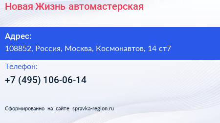 Новая Жизнь, автомастерская по адресу 108852, Россия, Москва, Космонавтов, 14 ст7 в дальнейшем Организация, размещена в следующих категориях: