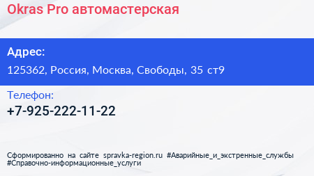 Okras Pro, автомастерская по адресу 125362, Россия, Москва, Свободы, 35 ст9 в дальнейшем Организация, размещена в следующих категориях: