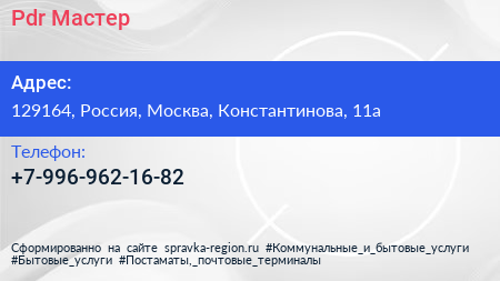 Pdr Мастер по адресу 129164, Россия, Москва, Константинова, 11а в дальнейшем Организация, размещена в следующих категориях:
