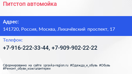 Питстоп, автомойка по адресу 141720, Россия, Москва, Лихачёвский проспект, 17 в дальнейшем Организация, размещена в следующих категориях: