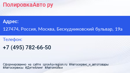 ПолировкаАвто.py по адресу 127474, Россия, Москва, Бескудниковский бульвар, 19а в дальнейшем Организация, размещена в следующих категориях: