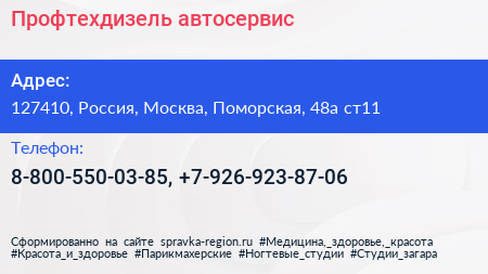 Профтехдизель, автосервис по адресу 127410, Россия, Москва, Поморская, 48а ст11 в дальнейшем Организация, размещена в следующих категориях: