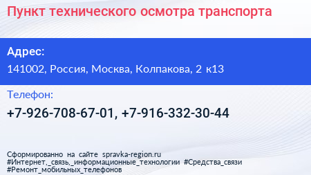Пункт технического осмотра транспорта по адресу 141002, Россия, Москва, Колпакова, 2 к13 в дальнейшем Организация, размещена в следующих категориях: