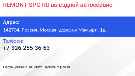 REMONT-SPC.RU, выездной автосервис по адресу 142704, Россия, Москва, деревня Мамыри, 1д в дальнейшем Организация, размещена в следующих категориях: