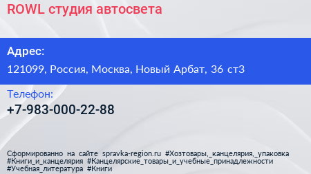 ROWL, студия автосвета по адресу 121099, Россия, Москва, Новый Арбат, 36 ст3 в дальнейшем Организация, размещена в следующих категориях: