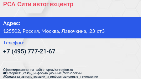 РСА Сити, автотехцентр по адресу 125502, Россия, Москва, Лавочкина, 23 ст3 в дальнейшем Организация, размещена в следующих категориях: