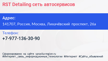 RST Detailing, сеть автосервисов по адресу 141707, Россия, Москва, Лихачёвский проспект, 26а в дальнейшем Организация, размещена в следующих категориях: