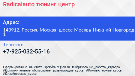 Radicalauto, тюнинг-центр по адресу 143912, Россия, Москва, шоссе Москва-Нижний Новгород, 1 в дальнейшем Организация, размещена в следующих категориях: