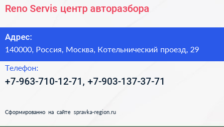 Reno-Servis, центр авторазбора по адресу 140000, Россия, Москва, Котельнический проезд, 29 в дальнейшем Организация, размещена в следующих категориях: