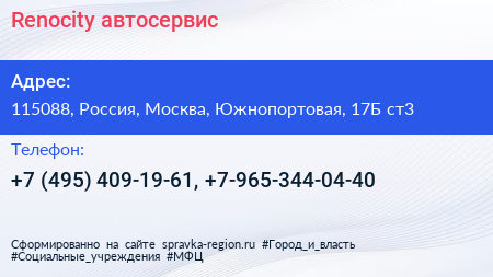Renocity, автосервис по адресу 115088, Россия, Москва, Южнопортовая, 17Б ст3 в дальнейшем Организация, размещена в следующих категориях: