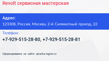 Revolt, сервисная мастерская по адресу 123308, Россия, Москва, 2-й Силикатный проезд, 22 в дальнейшем Организация, размещена в следующих категориях: