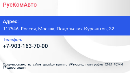 РусКомАвто по адресу 117546, Россия, Москва, Подольских Курсантов, 32 в дальнейшем Организация, размещена в следующих категориях: