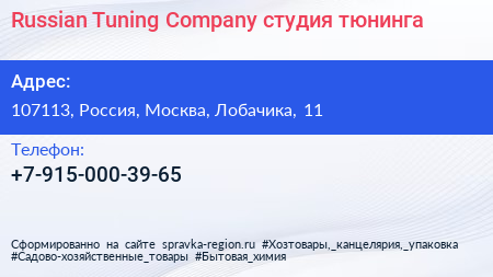 Russian Tuning Company, студия тюнинга по адресу 107113, Россия, Москва, Лобачика, 11 в дальнейшем Организация, размещена в следующих категориях: