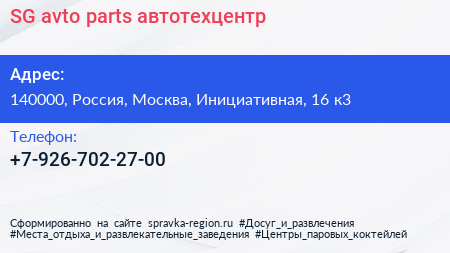 SG avto parts, автотехцентр по адресу 140000, Россия, Москва, Инициативная, 16 к3 в дальнейшем Организация, размещена в следующих категориях: