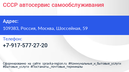 СССР, автосервис самообслуживания по адресу 109383, Россия, Москва, Шоссейная, 59 в дальнейшем Организация, размещена в следующих категориях: