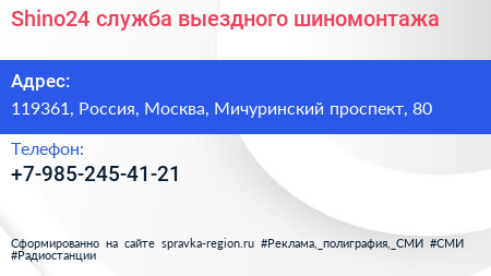 Shino24, служба выездного шиномонтажа по адресу 119361, Россия, Москва, Мичуринский проспект, 80 в дальнейшем Организация, размещена в следующих категориях: