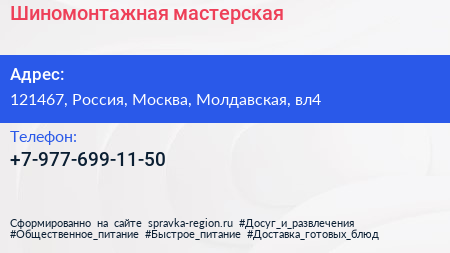 Шиномонтажная мастерская по адресу 121467, Россия, Москва, Молдавская, вл4 в дальнейшем Организация, размещена в следующих категориях: