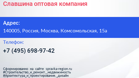 Славшина, оптовая компания по адресу 140005, Россия, Москва, Комсомольская, 15а в дальнейшем Организация, размещена в следующих категориях: