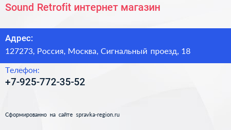 Sound & Retrofit, интернет-магазин по адресу 127273, Россия, Москва, Сигнальный проезд, 18 в дальнейшем Организация, размещена в следующих категориях: