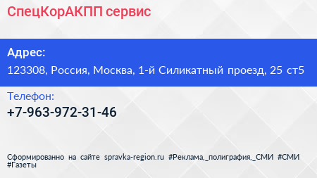 СпецКорАКПП, сервис по адресу 123308, Россия, Москва, 1-й Силикатный проезд, 25 ст5 в дальнейшем Организация, размещена в следующих категориях: