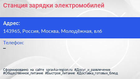 Станция зарядки электромобилей по адресу 143965, Россия, Москва, Молодёжная, вл6 в дальнейшем Организация, размещена в следующих категориях:
