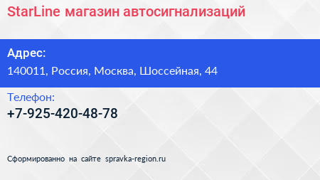 StarLine, магазин автосигнализаций по адресу 140011, Россия, Москва, Шоссейная, 44 в дальнейшем Организация, размещена в следующих категориях: