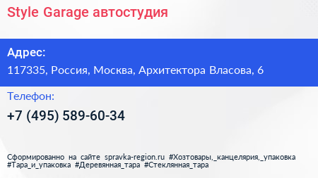 Style Garage, автостудия по адресу 117335, Россия, Москва, Архитектора Власова, 6 в дальнейшем Организация, размещена в следующих категориях: