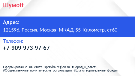 Шумоff по адресу 121596, Россия, Москва, МКАД 55 Километр, ст60 в дальнейшем Организация, размещена в следующих категориях: